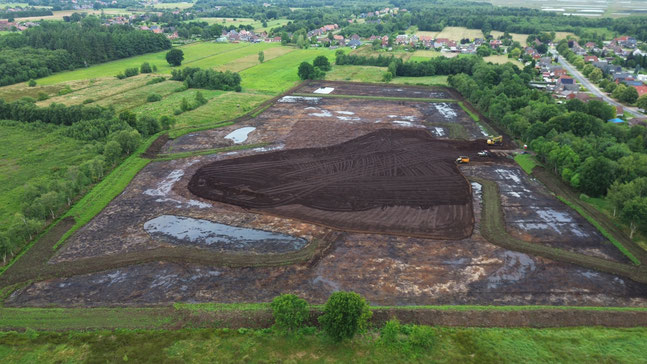 Nachdem der mineralische Oberboden abgeschoben und an den Rand der Fläche zwischengelagert wurde, konnte das vom Landkreis Aurich, der Stadt Wiesmoor und dem NABU geplante Großprojekt